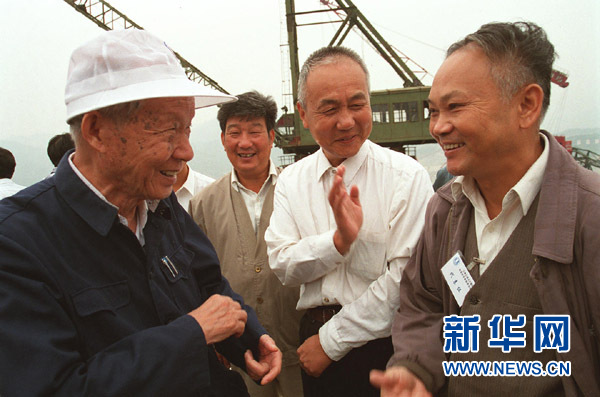 90岁高龄的张光斗(左)在三峡工程工地与技术人员交谈