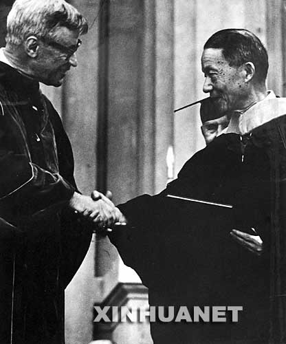 1981年,张光斗教授(右)在美国接受加州大学萨克逊校长授予的哈斯国际奖