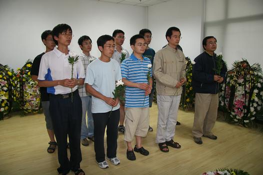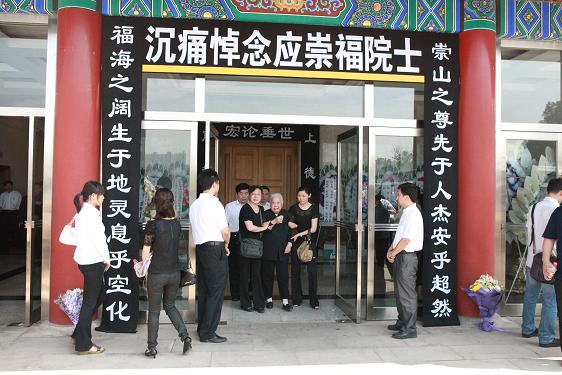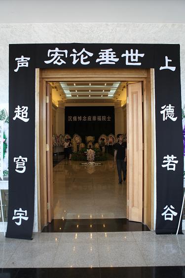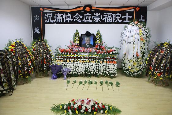 6月30日晚,噩耗传来,全所上下十分悲痛。在应崇福院士治丧委员会的指挥下,应院士治丧办公室连夜在所内设立了灵堂,供全所同志和社会各界人士前来悼念应崇福院士,表达缅怀之情。灵堂庄严而肃穆,灵堂门口“崇山之尊 先于人杰 安乎超然;福海之阔 生于地灵 息乎空化”的挽联寄托了对应先生无尽哀思。灵堂内哀乐低迴,束束鲜花簇拥着应先生的遗像,所领导、机关各职能部门及实验室的同志们24小时为应先生守灵。声学所各实验室、机关以及后勤保障部门的科研管理骨干、广大职工及青年学子500余人,自发地集体到灵堂追思应崇福院士。中科院高技术局田静局长、国家自然基金委张守著处长、张仁和院士、李启虎院士、侯朝焕院士、汪承灏院士,以及来自有关研究所领导、中国科大、清华大学、中科院研究生院、南京大学、同济大学、中国声学学会、中国声学标准化技术委员会、中科院侨联及海淀区侨联等单位代表闻讯纷纷赶到灵堂吊唁。