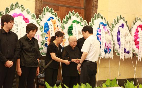 院士工作局、国家自然科学基金委员会数理科学部、北京市政协办公厅、宁波市人民政府、清华大学、中国科大、河海大学、中科院研究生院、中科院侨联、中国华侨历史博物馆、中国声学学会、中国机械工程学会等单位敬送的花圈依次排列,简洁而庄重。