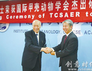 刘瑞玉院士(左)获得国际甲壳动物学会杰出研究贡献奖