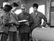 1978年,马大猷(右二)和研究人员在北京第一通用机械厂了解扩散消声...