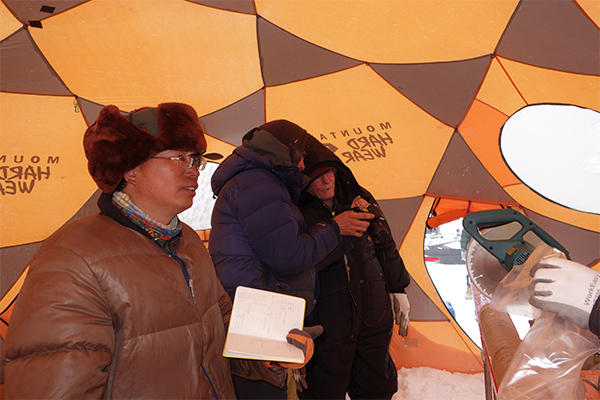 “白天,太阳照射和人的活动使得打钻帐篷内温度升高,冰可能会融化,而钻机运转时必须保证冰处于冻结状态,否则融化后的再冻结过程很可能使得钻头和钻筒冻结在钻孔中。需要注意帐篷内的温度保持在低于零度之下。”钻取冰芯的深夜,发电机的轰鸣声压住了帐篷外七八级的大风。