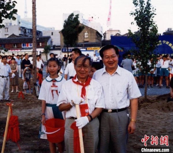 郑哲敏院士(左)在院士林种下银杏树