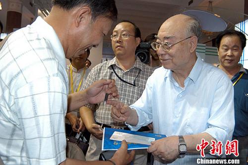 资料图:于敏院士(右)为市民签名。中新社发 徐曦弋 摄