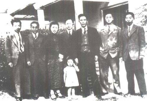 钱学森与周培源夫妇以及多名在美留学生合影。