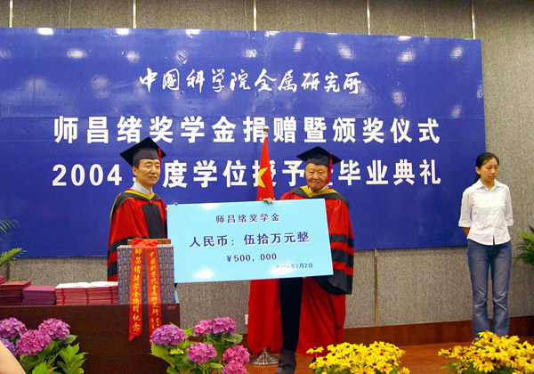 2004年师昌绪院士向金属所捐赠50万元人民币,设立师昌绪奖学金