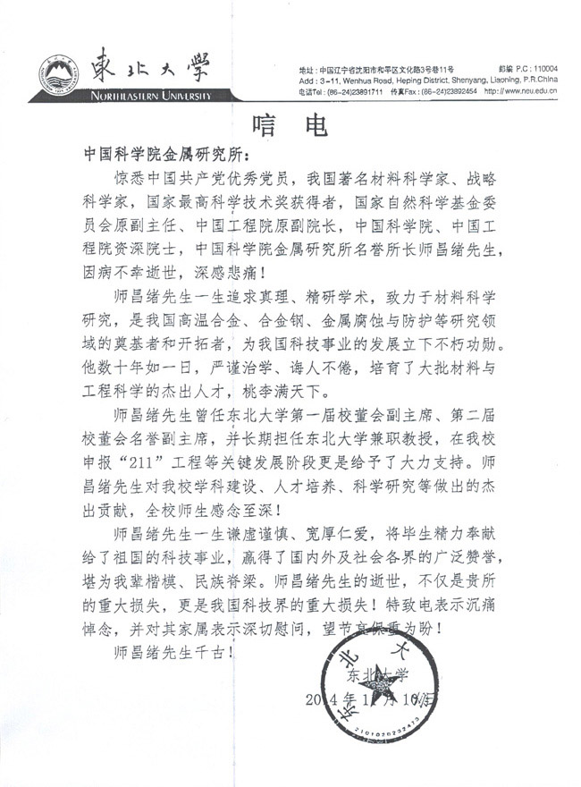 东北大学致唁电