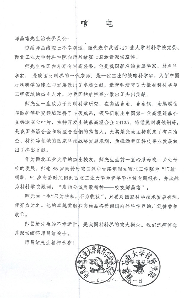 中共西北工业大学材料学院委员会、西北工业大学材料学院致唁电