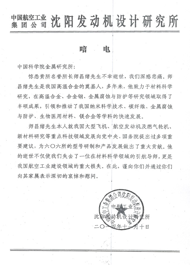中国航空工业集团公司沈阳发动机设计研究所致唁电