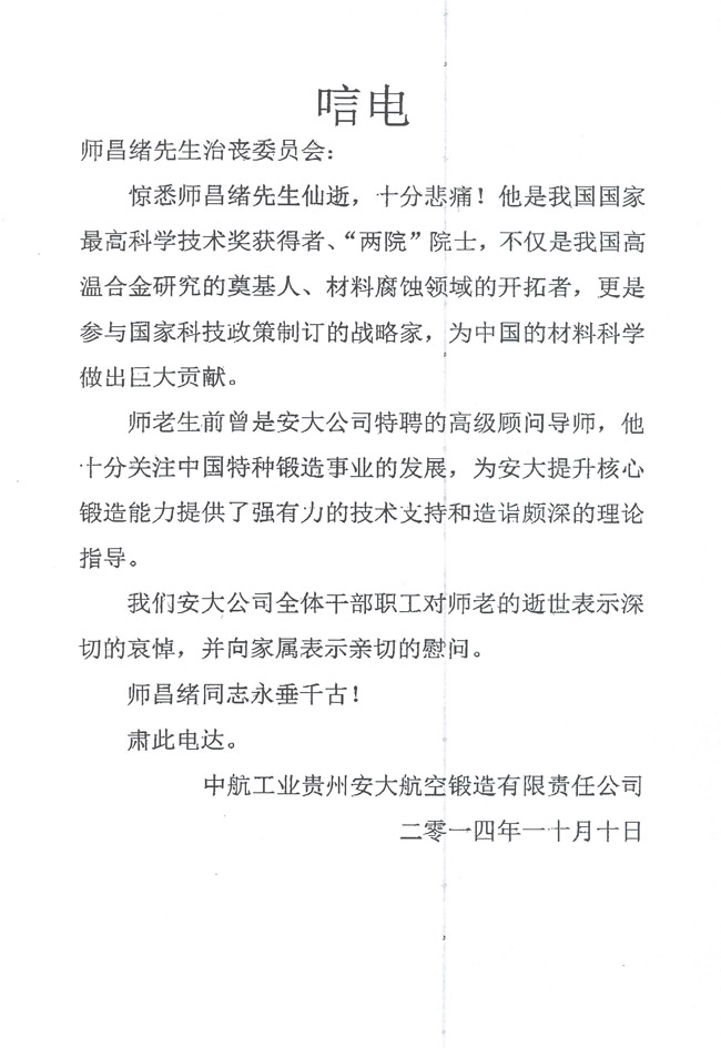中航工业贵州安大航空锻造有限责任公司致唁电