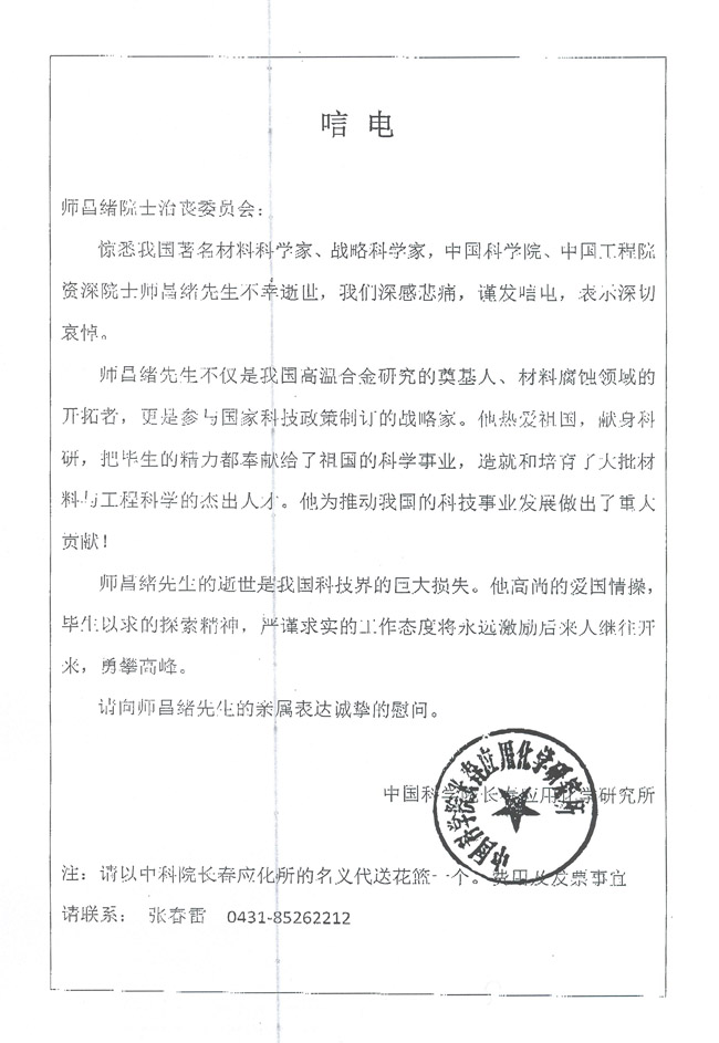 无码影片 长春应用化学研究所致唁电