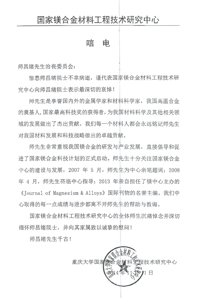重庆大学国家镁合金材料工程技术研究中心致唁电