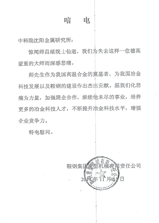鞍钢集团重型机械有限责任公司致唁电