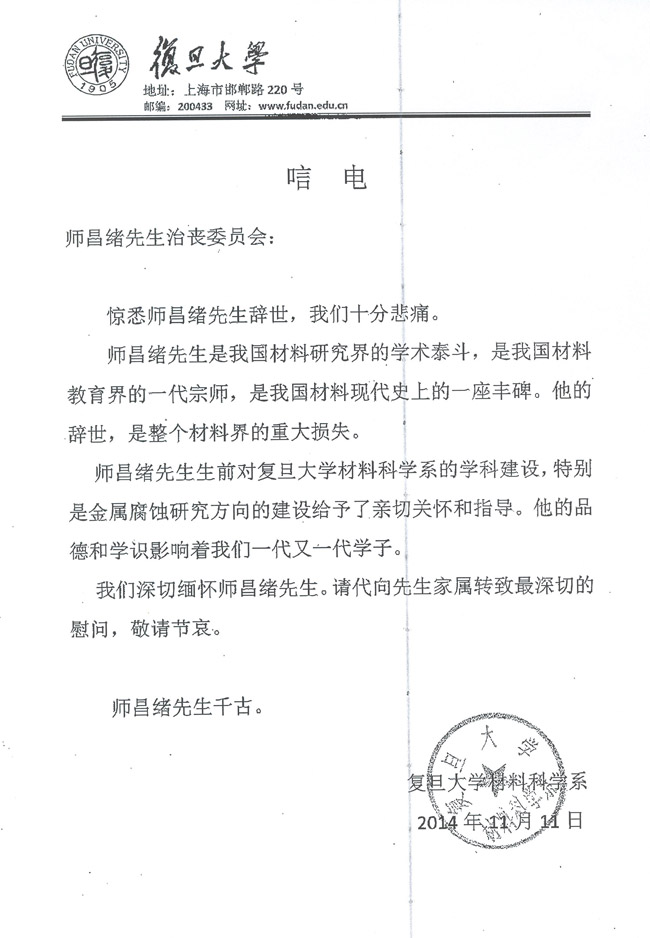 复旦大学材料科学系致唁电
