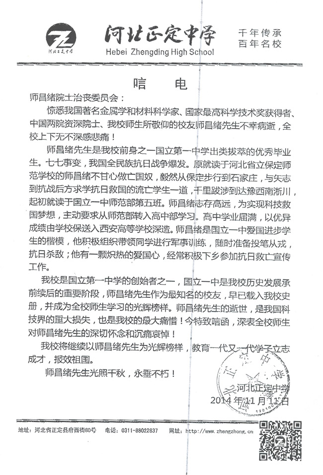 河北正定中学致唁电