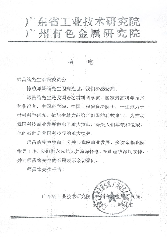 广东省工业技术研究院(广州市有色金属研究所)致唁电