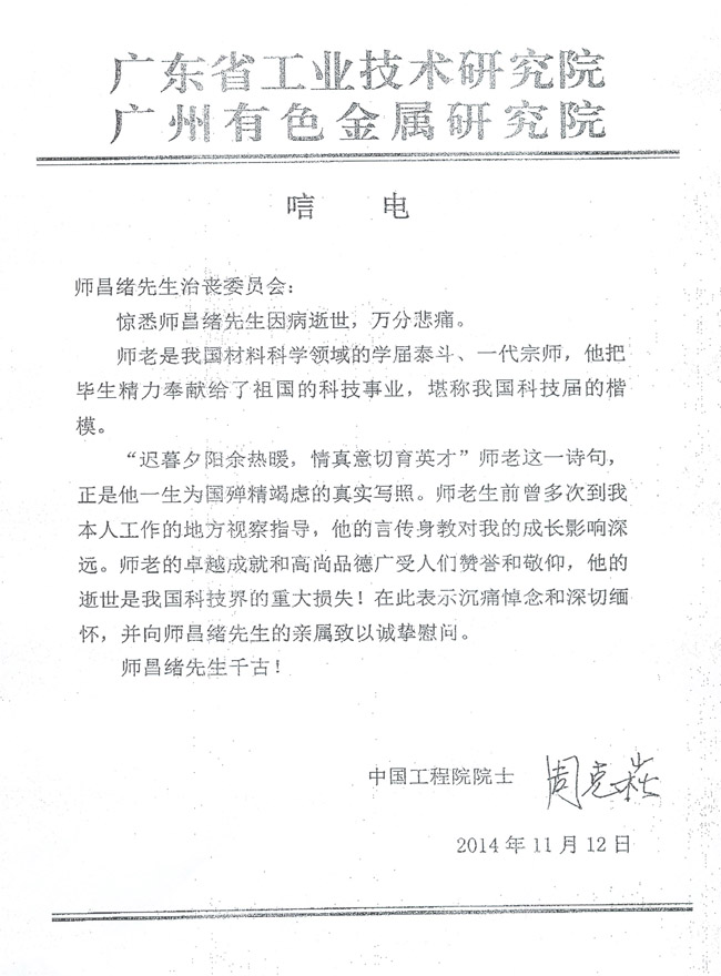 中国工程院院士周克崧致唁电