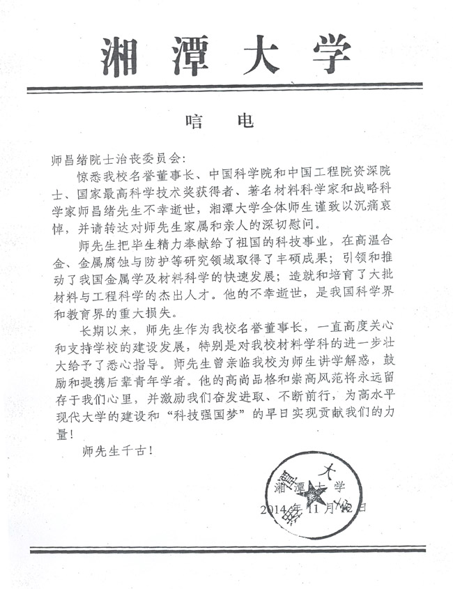 湘潭大学致唁电