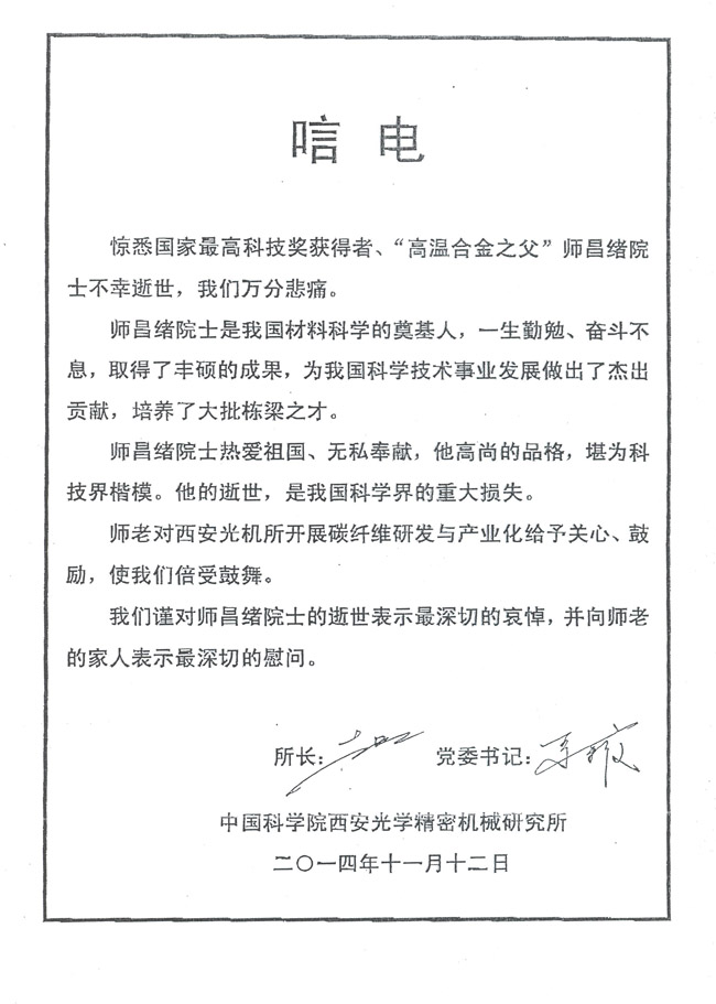 无码影片 西安光学精密机械研究所 所长赵卫、党委书记马彩文致唁电