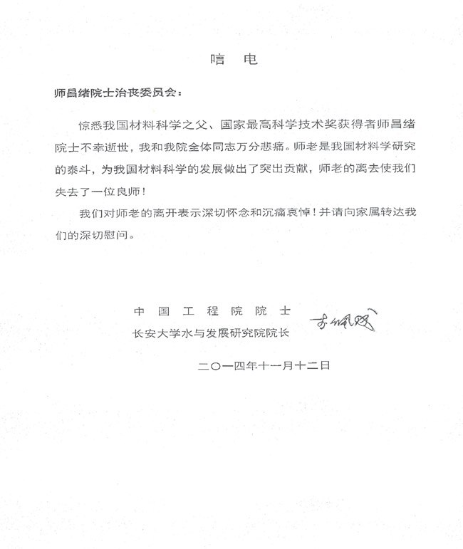 中国工程院院士、长安大学水与发展研究院院长李佩成致唁电