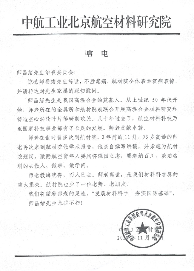 中航工业北京航空材料研究院致唁电