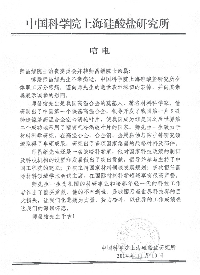无码影片 上海硅酸盐研究所致唁电