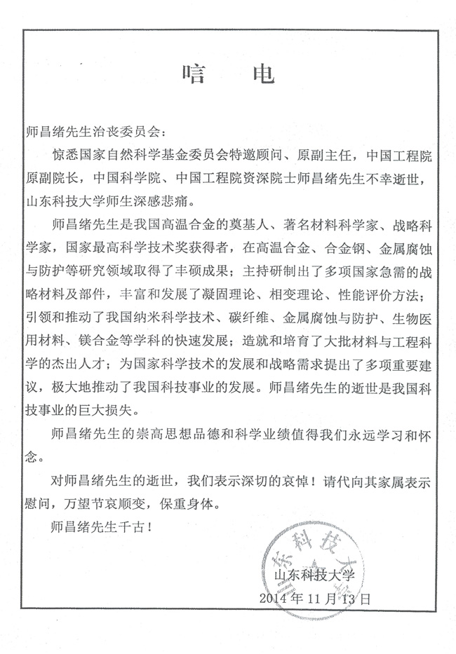 山东科技大学致唁电