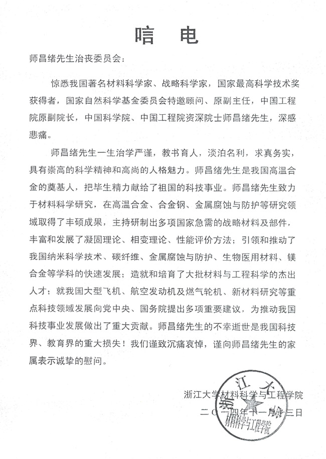 浙江大学材料科学与工程学院致唁电