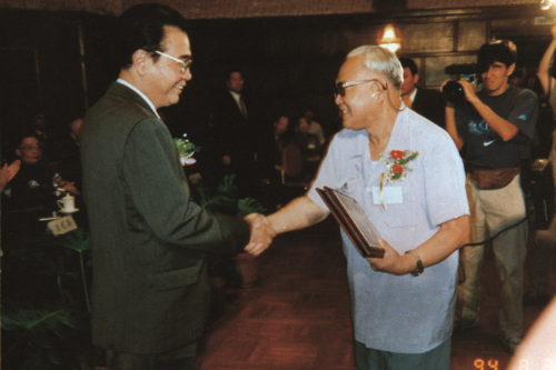 1994年,吴文俊获香港求是科技基金会“杰出科学家奖”,李鹏颁奖