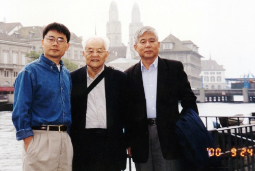 2000年,吴文俊与高小山(左一)、石赫(右一)在瑞士苏黎世