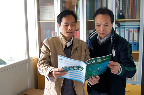 2012年11月6日,王逸平与上海药物所研究员宣利江讨论问题