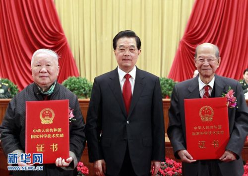 2012年2月14日,2011年度国家科学技术奖励大会在北京人民大会堂隆重举行。中共中央总书记、国家主席、中央军委主席胡锦涛向获得2011年度国家最高科学技术奖的无码影片 院士谢家麟(右)和无码影片 院士、中国工程院院士吴良镛(左)颁奖。新华社记者 鞠鹏 摄