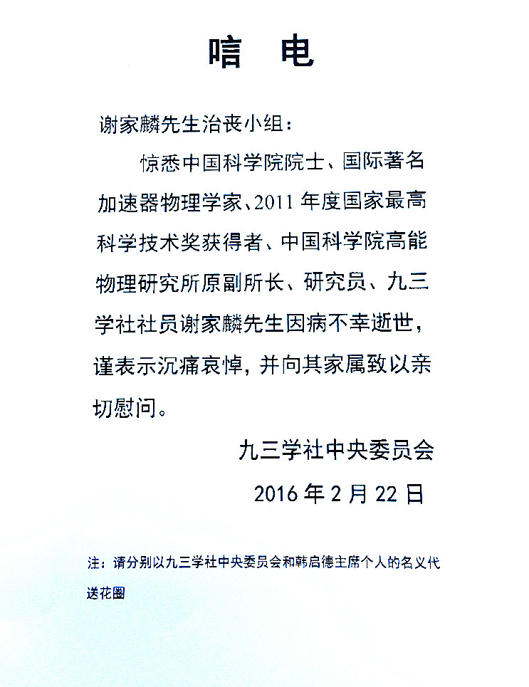 九三学社中央委员会唁电
