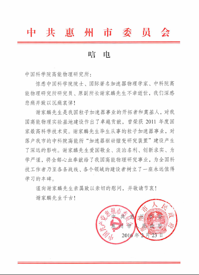 中共惠州市委员会、广东省惠州市人民政府唁电