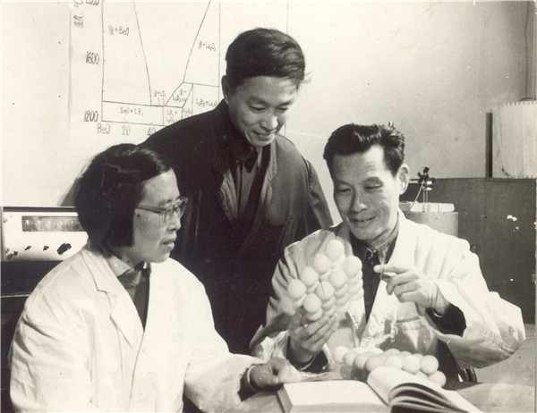 1985年,严东生与林祖纕、郭祝崑讨论材料相平衡理论研究工作