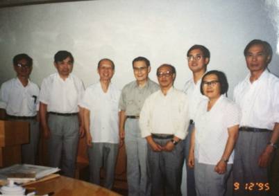 1995912日作者博士论文答辩会场景,照片左起为中科院冶金所施天生研究员、上海交通大学林栋樑教授、同济大学诸培南教授、严东生先生、中科院上海硅酸盐所郭景坤院士、作者本人、中科院上海硅酸盐所林祖镶研究员、中科院上海硅酸盐研究所黄校先研究员)