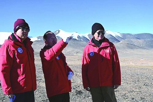 姚檀栋(中)在普若岗日冰原介绍10号冰川的变化。本报记者冯丽妃/摄