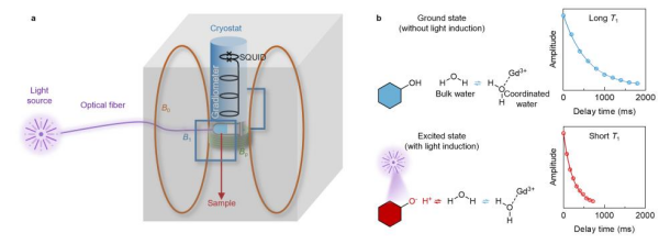 (a)光场融合极低场磁共振系统示意图;(b)基态与激发态下纳米材料界面质子交换及磁共振弛豫时间拟合示意图