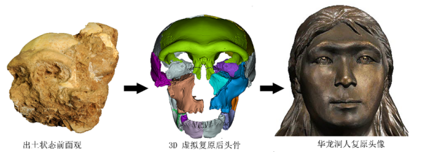 2015年,华龙洞出土了一件完整人类头骨,研究人员复原了她的容貌,发现这个13岁左右的“东至姑娘”长得有点“现代”:凹陷的眉间、较深的泪腺窝等。她还有和现代人相似的下巴,而下巴被认为是现代人的标志性特征。