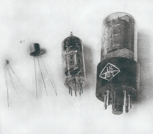 半导体研究室早期研制的硅平面晶体管(芝麻管,左一),右一为普通电子管。
