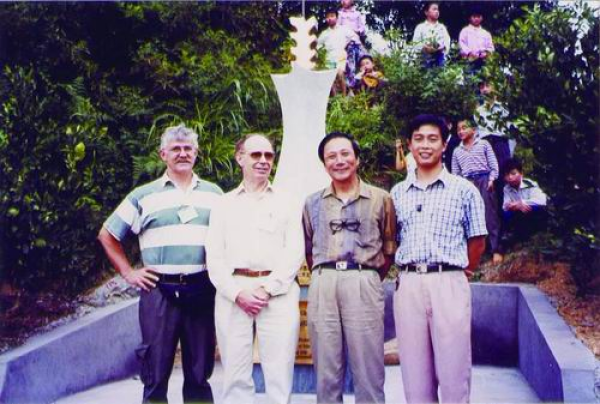 1998年,国际界线工作组在浙江常山县参加达瑞威尔阶“金钉子”碑揭牌典礼。从左至右为法国学者弗洛伦廷·帕里斯、巴里·威比、陈旭、张元动。