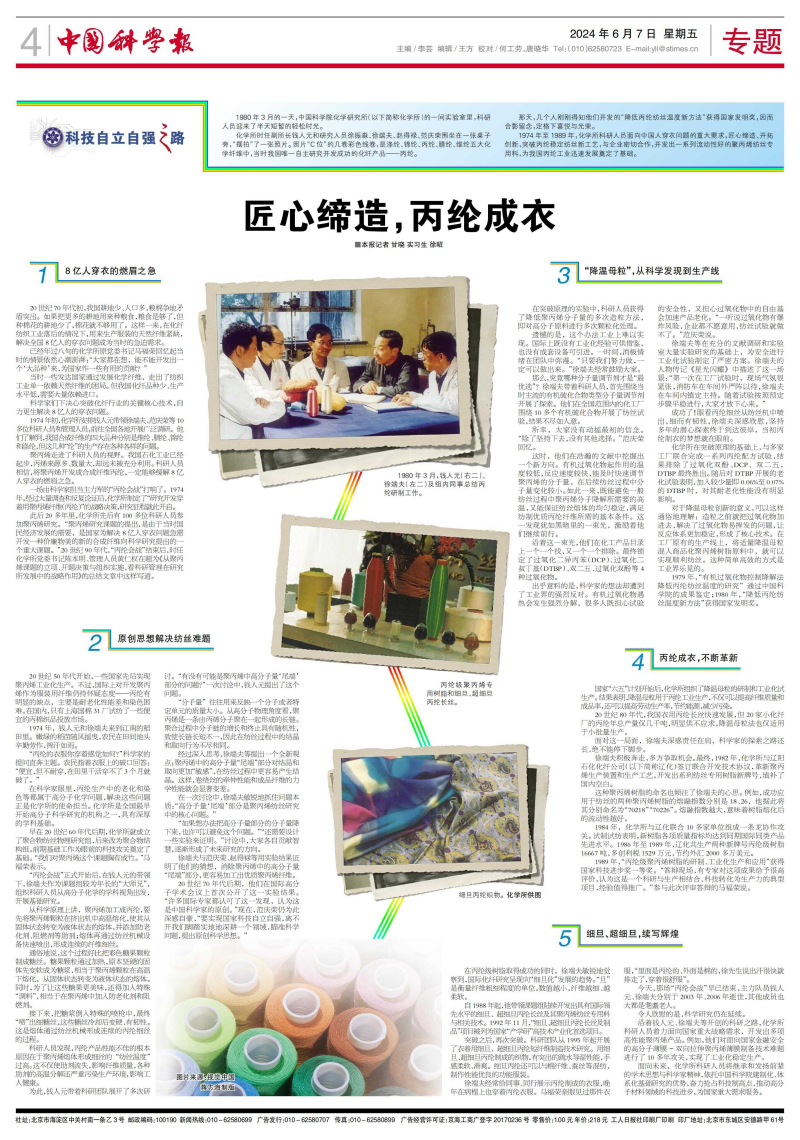 1974年初,化学所安排钱人元带领徐端夫、范庆荣等10多位科研人员和管理人员,前往全国各地开展广泛调研。他们了解到,我国合成纤维的四大品种分别是维纶、腈纶、锦纶和涤纶,但这几种“纶”的生产存在各种各样的问题。