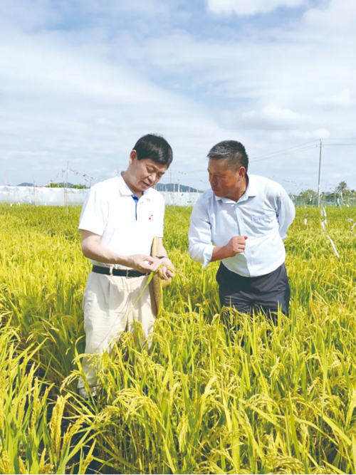 水稻是喜温作物。在海南和天津等地的育种基地,刘贵富和陈明江头顶烈日、脚穿胶鞋,日复一日地观察水稻生长情况。最热的时候气温超过40摄氏度,上晒下蒸,他们双脚泡得发烫,衣服湿了又干、干了又湿,结出一朵朵白白的盐花。