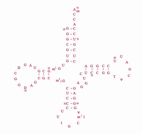 酵母丙氨酸转移核糖核酸的三叶草二级结构模型。