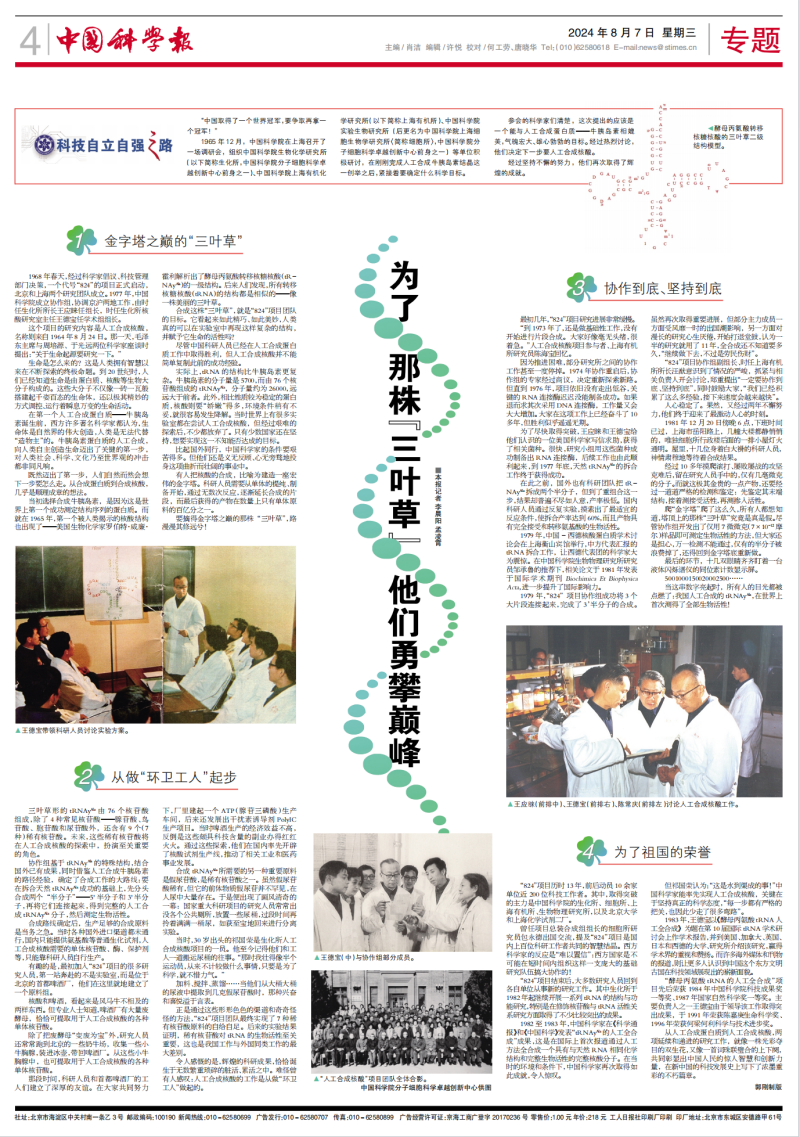1982至1983年,中国科学家在《科学通报》和《中国科学》发表“tRNAyAla的人工全合成”成果,这是在国际上首次报道通过人工方法全合成一个具有与天然RNA相同化学结构和完整生物活性的完整核酸分子。在当时的环境和条件下,中国科学家再次取得如此成就,令人惊叹。