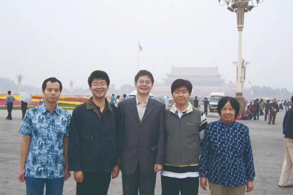 黄令仪(右一)与胡伟武(右三)及龙芯课题组成员在龙芯2C芯片设计运行成功后到天安门观看升旗。计算所供图