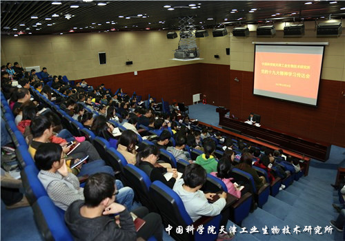 天津工业生物技术研究所召开了学习贯彻党的十九大精神宣传动员会,研究所党委书记邢雪荣为全体职工、研究生全面深入解析十九大报告,研究所职工、研究生300余人参加了会议。动员会由纪委书记庞维主持。