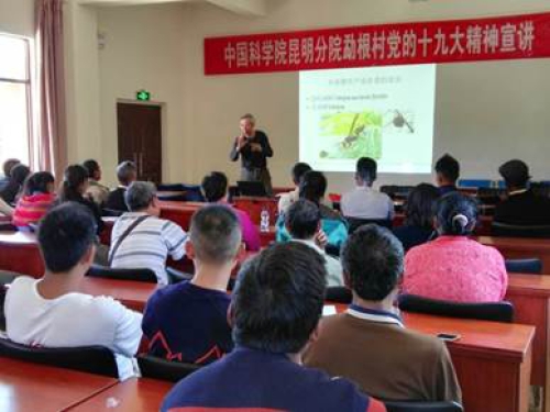 在勐根村委会,昆明分院分党组副书记、纪检组组长杨君兴围绕党的十九大精神学习体会,结合自身党建及科研工作经验,以《学习十九大精神,谋划澜沧乡村振兴思路》为题,为勐根村党总支及五个党支部的党员干部作党的十九大精神辅导报告。杨君兴从澜沧及邻近地区动物资源与民族关系、动植物资源本底、动物资源可持续利用、生态旅游、生态茶产业等方面进行分析讲解,并代表昆明分院向勐根村党总支及各支部赠送了十九大报告《决胜全面建成小康社会 夺取新时代中国特色社会主义伟大胜利》单行本、党的十九大修改通过的《中国共产党章程》《中国共产党第十九次全国代表大会文件汇编》等党建相关资料和书籍。