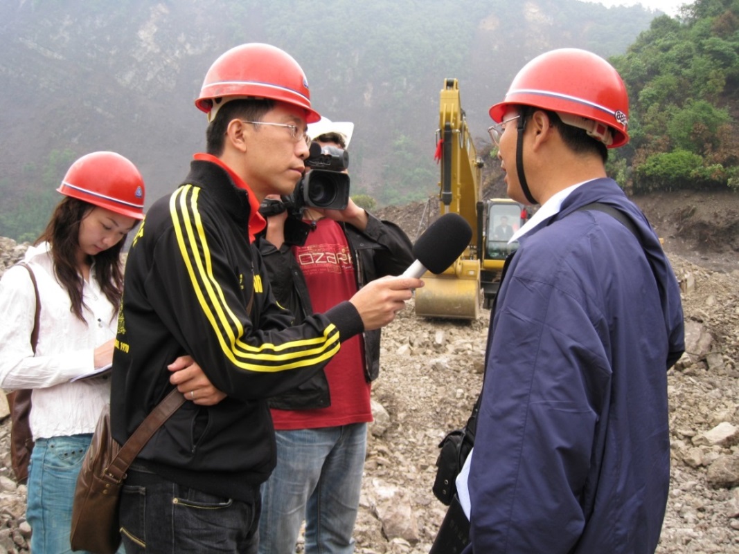 在肖家桥堰塞湖疏通现场接受成都电视台记者的采访